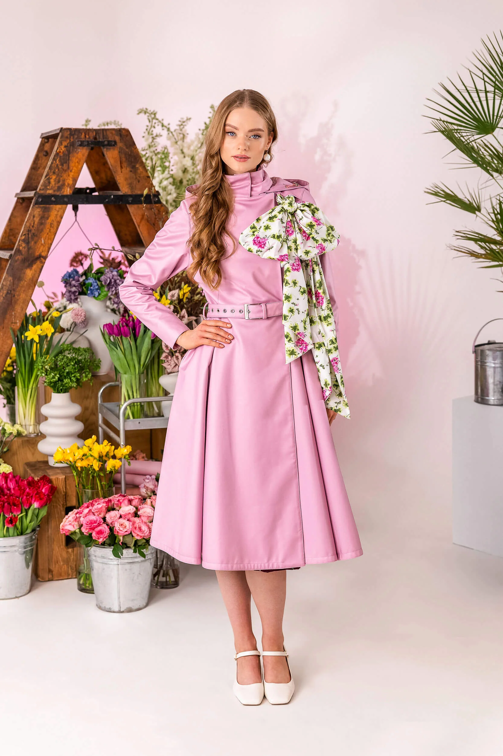 A women’s double-breasted soft pink coat with a matching belt and a removable floral scarf that can be worn as a bow, belt, scarf, or decorative accent. Lined with soft pink Italian satin, it offers comfort and elegance.