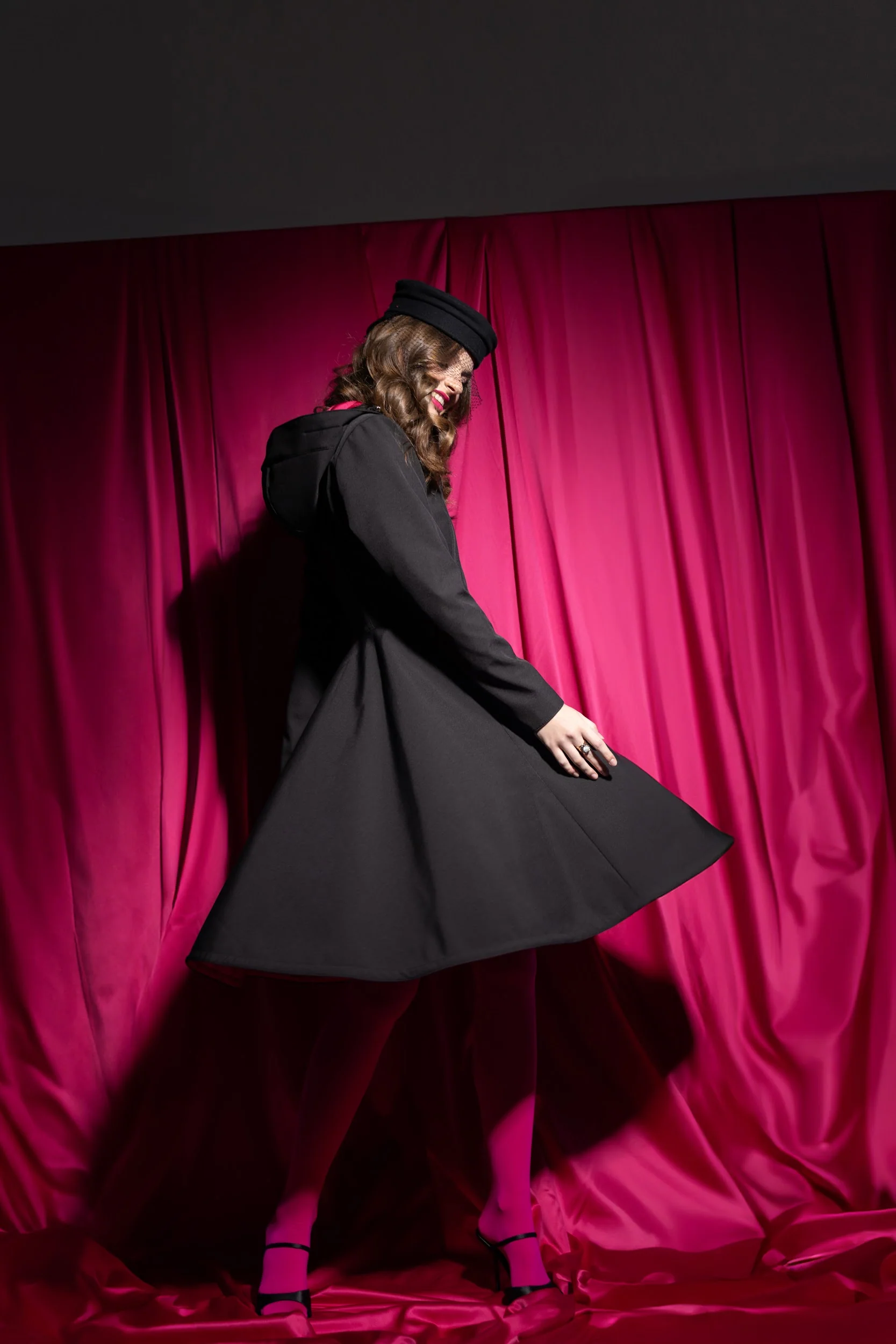 Fit and Flare Coat with Full Circle Skirt in Black with Fuchsia Pink Lining | Pink Ruby
